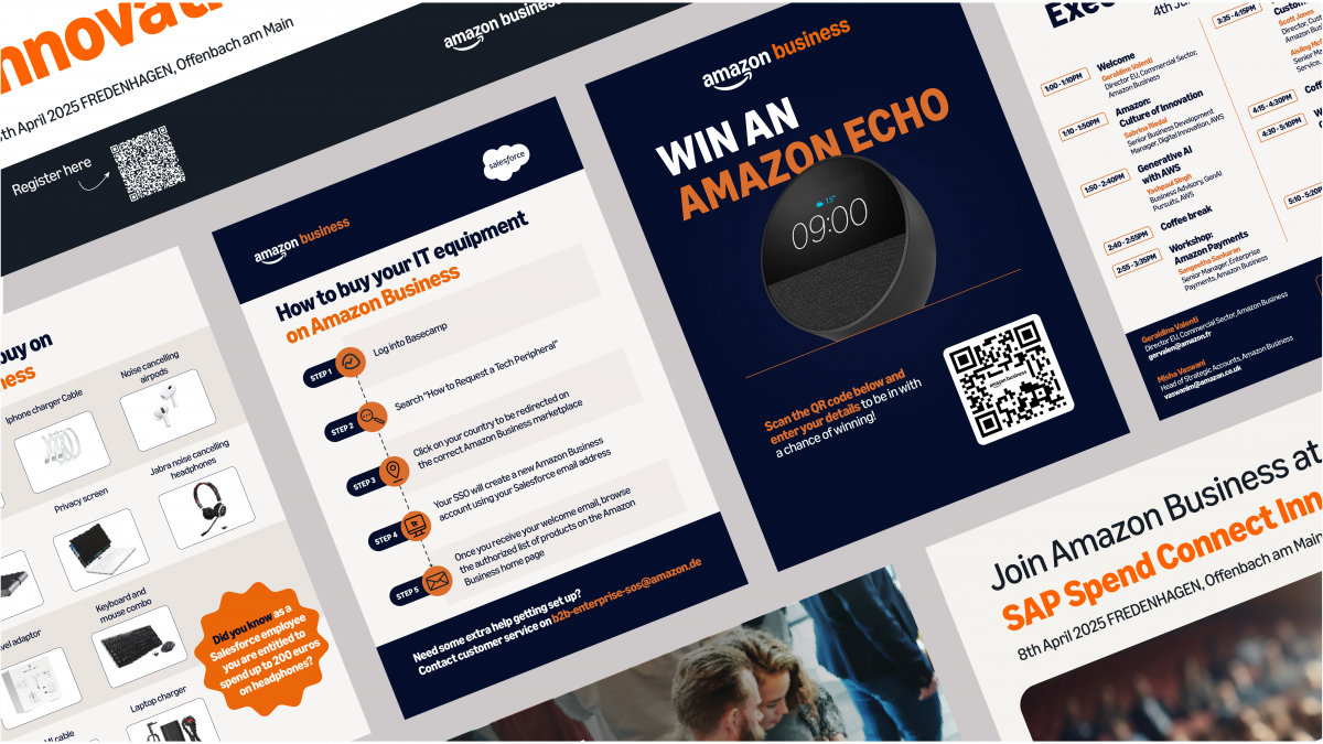 Amazon Business needed a reliable creative partner to support their marketing and communications teams with a wide range of assets from roller banners and leaflets to training decks, roll-ups, web assets, and social creatives. The challenge was not just about quality, but about speed and flexibility. Campaigns and internal needs often required same-day or next-day turnaround, leaving no room for long lead times or delays.